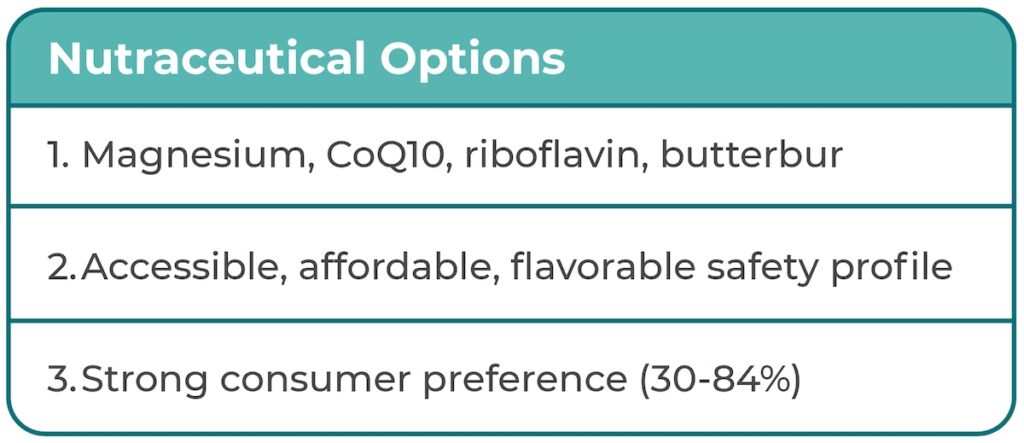 However, their widespread use remains limited by high cost, restricted insurance coverage, and a lack of long-term safety data beyond seven years. In contrast, nutraceuticals like magnesium, CoQ10, riboflavin, and butterbur offer a more accessible and affordable approach, with a favorable safety profile and strong consumer preference for non-pharmacologic therapies.